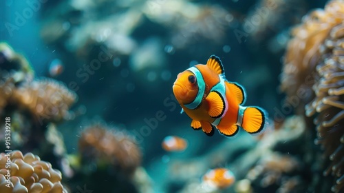 A clown fish with a distinctive orange and white stripe pattern swims amongst colorful corals and an