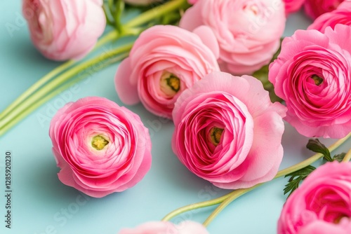 A cluster of bright pink flowers arranged on a calm blue background