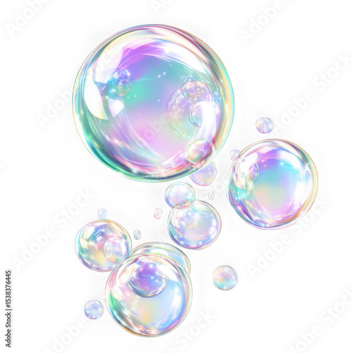 A cluster of iridescent soap bubbles floating against a white background