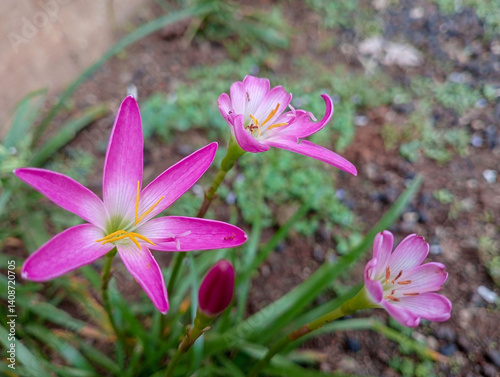A cluster of Pink Rain Lily, Zephyranthes carinata flowering in spring in Nagarkot in the Kathmandu valley, Nepal.