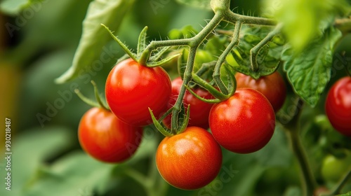 A cluster of red cherry tomatoes ripen in a greenhouse garden, their vibrant hue highlighting their rich vitamin content and health benefits.