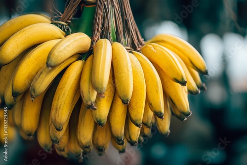 A cluster of ripe bananas is displayed in a bustling produce market, illuminated by warm daylight, inviting shoppers to select fresh fruit for their needs