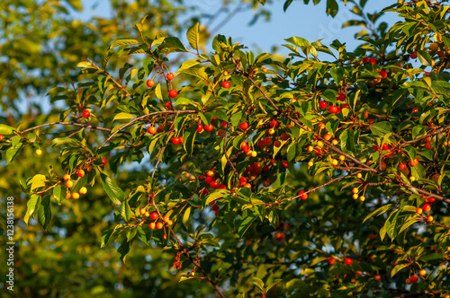 A cluster of ripe cherries glows in the sunlight, surrounded by green leaves and a soft-focus sky.