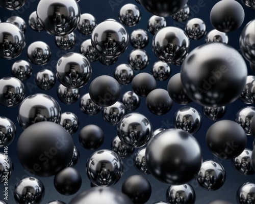 A cluster of shiny black spheres floating in a dark background, creating a dynamic and abstract visual effect.
