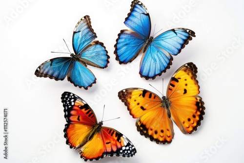 A cluster of vibrant butterflies in different colors sitting on a white surface
