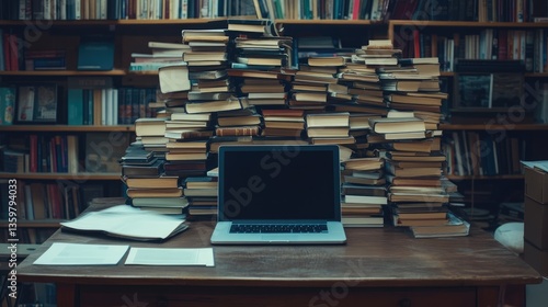 A cluttered desk with a laptop surrounded by stacks of books in a cozy library setting, evoking a studious atmosphere