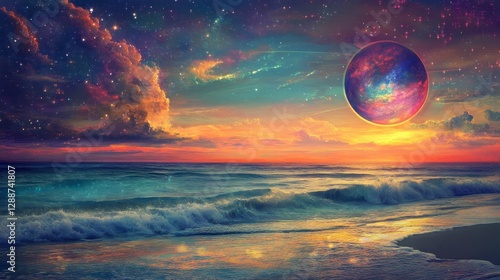 A coastal scene at dusk, with two vibrant planets illuminating the ocean waves.