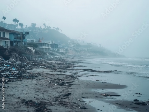 a coastal town shrouded in thick smog, with oil spills tainting the ocean and litter scattered across the beach, highlighting environmental issues and the impact of pollution on nature