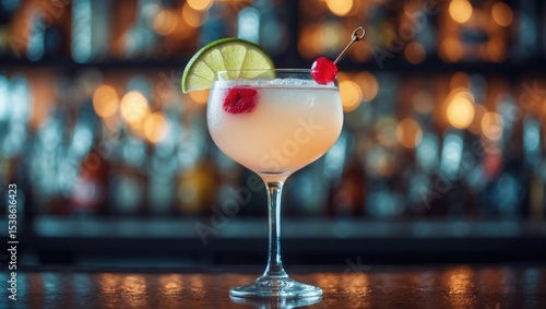 A cocktail glass garnished with a lime slice and berry on a skewer resting on the bar counter against a blurred background.