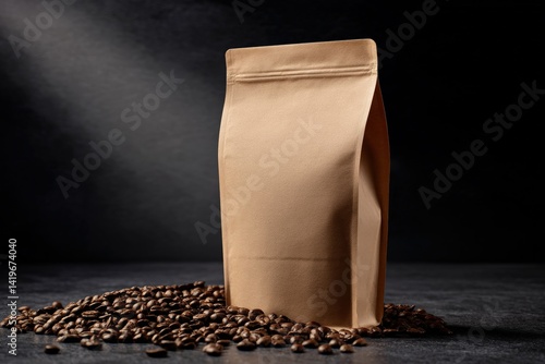 A coffee bag stands upright surrounded by scattered coffee beans, all set against a dark, moody backdrop, highlighting the rich textures and colors of the scene.