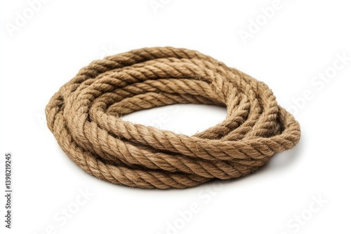 A coiled brown rope resting on a plain white surface in a studio setting with soft natural lighting