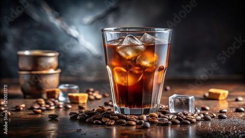 A cold brew coffee beverage in a clear glass with condensation on the outside and ice cubes floating inside , cups, coffee, cups