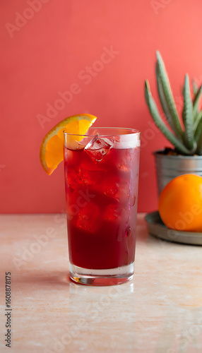 A cold citrus fruit cocktail with lime and a glass of orange juice on a table