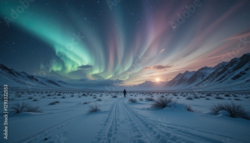 A cold wasteland with a mystical aurora borealis dancing