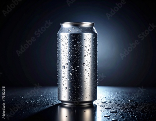 A cold, wet silver aluminum beverage can covered in condensation, standing on a dark reflective surface with dramatic lighting.
