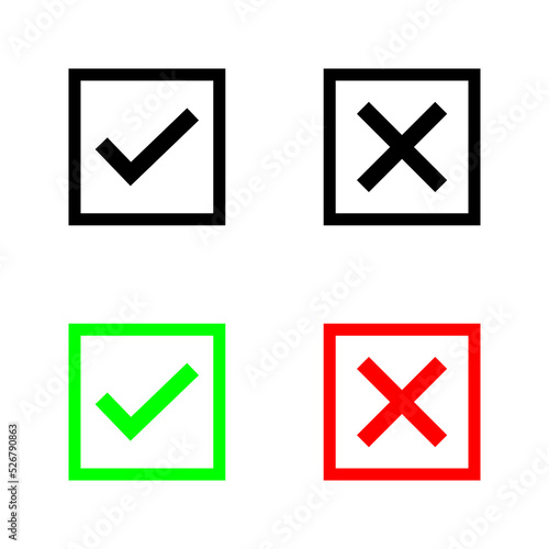 A colection of web button variants: green check mark and red cross. Many options, Vector icons.