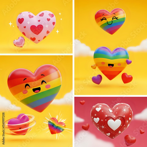 A collage of colorful hearts with various designs and expressions on a yellow and pink background