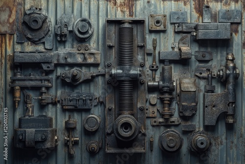 A collage of rusty, vintage industrial machine parts arranged on a metallic background.