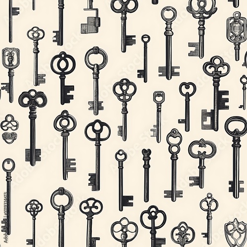 A collage of various vintage keys arranged in a pattern on a light background.