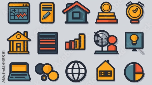 A collection of 15 minimalist outline icons that symbolize various aspects of corporate structure including finance data analysis technology and organizational management