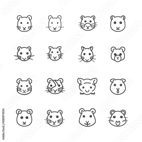 A Collection of 16 Line Art Hamster Faces with Different Expressions