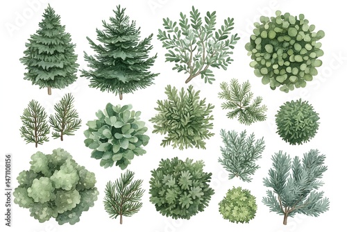 A collection of 16 watercolor illustrations of various coniferous trees and shrubs