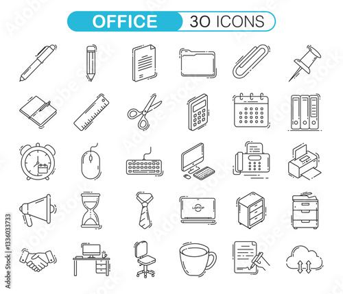 A collection of 30 simple icons representing various office tools and activities, including stationery, technology, and organizational items.