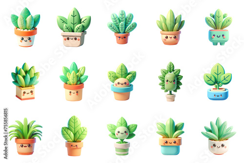 A collection of 3D cartoon-style plant character with a face, cute houseplant.