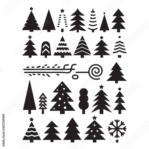 A collection of 60 minimalist black Christmas tree silhouettes on white background.