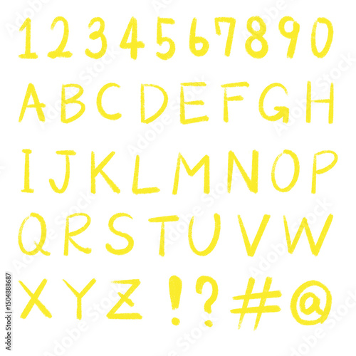 A collection of abc alphabets and numbers drawn with yellow colored pencils and crayon lines on rough surfaces