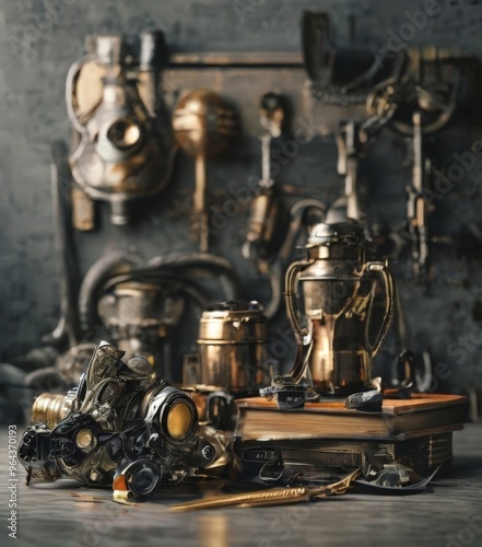 a collection of antique and vintage items, including brass and metal objects, arranged on a wooden surface. The items are mounted on a wall, creating a visually striking display.