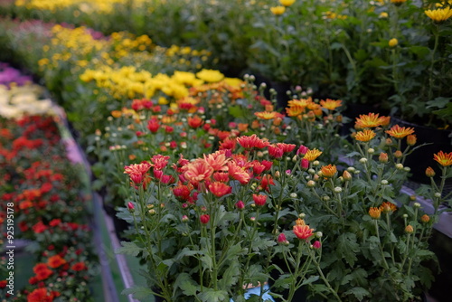 a collection of beautiful yellow and red blooming flower plants in a sunny garden area