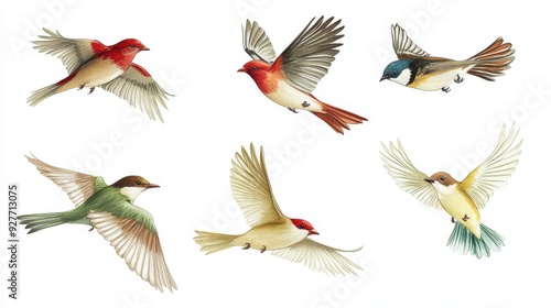A collection of beautifully illustrated birds in flight, showcasing vibrant colors and graceful movements.