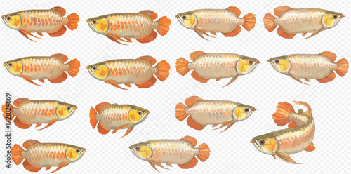 A collection of beautifully illustrated Golden Arowana fish swimming in a repeating pattern on a transparent background.