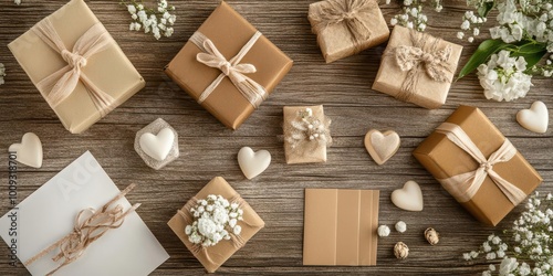 A collection of beautifully wrapped gifts and decorative elements on a wooden surface.