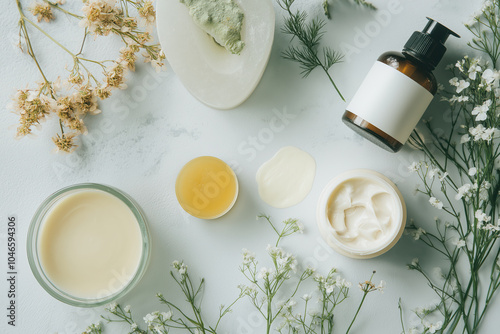 A collection of beauty products including lotion, cream