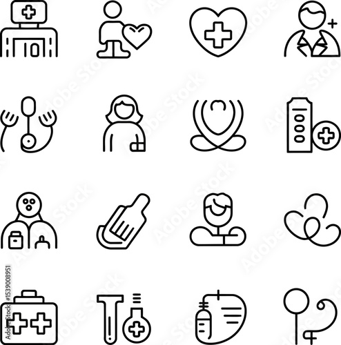 A collection of black and white medical and health related icons in a grid format