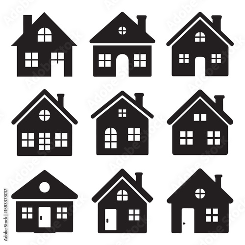 A collection of black and white vector houses, each with a unique design, showcases homes, buildings, and residential architecture on a plain white background