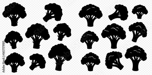 A collection of black broccoli silhouettes in various sizes and angles on a transparent background.