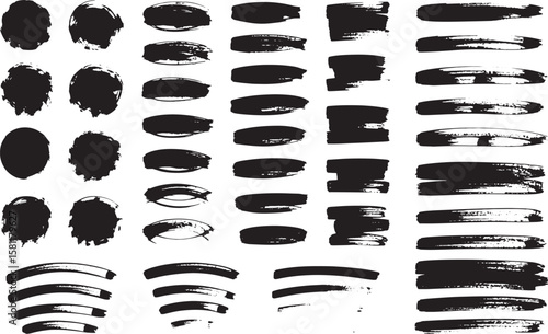 A collection of black brush strokes, circles, and paint splatters on white isolated on transparent background