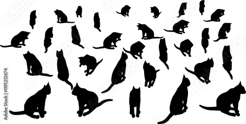 A collection of black cat silhouettes in various poses, featuring sitting, standing, and playful stances, perfect for design, decoration, and creative projects.