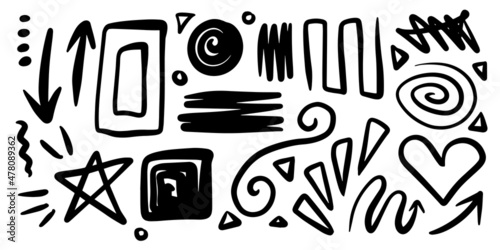 A collection of black doodle lines and abstract random icons on an isolated background.