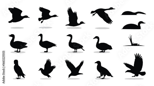 A collection of black silhouette illustrations of birds arranged in a grid pattern against a white background.