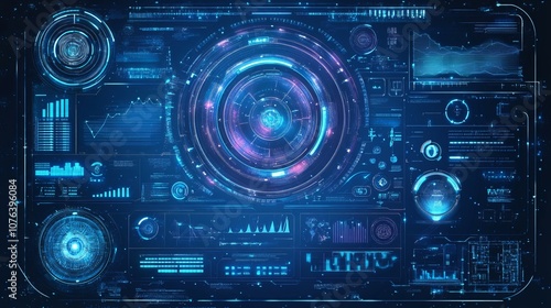 A collection of blue HUD and sci-fi UI elements, including futuristic circles, frames, callout titles, loading bars, arrows, holograms for VR, icons, bar labels, and lines.