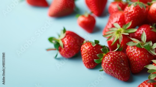 A collection of bright, fresh strawberries scattered on a pastel blue surface, with focus on their texture, color, and the leafy green tops against the vibrant backdrop.