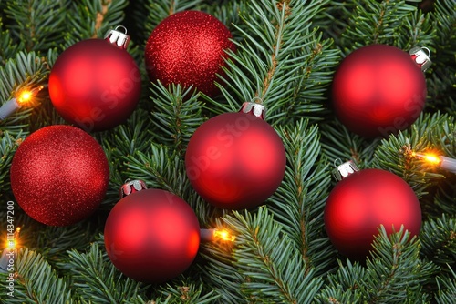 A collection of bright red Christmas ornaments hanging from a decorated Christmas tree