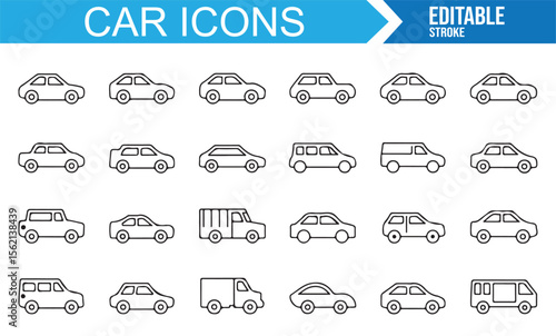 A collection of car icons, including various types of vehicles such as sedans, vans, SUVs, and trucks in a minimalist line art style.