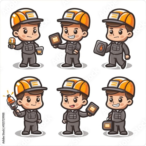 A collection of cartoon characters in work attire, showcasing various tools and actions.