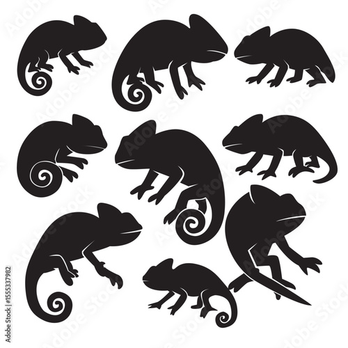 A collection Of chameleon silhouette illustration featuring various dynamic poses perfect for nature themed design, background, decorations, stickers, Clipart, design materials, etc