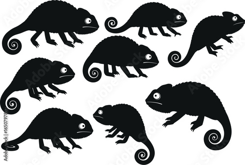 A collection of chameleon silhouettes in various poses, for themes of animals, reptiles, wildlife, and exotic pets in design and illustration projects.